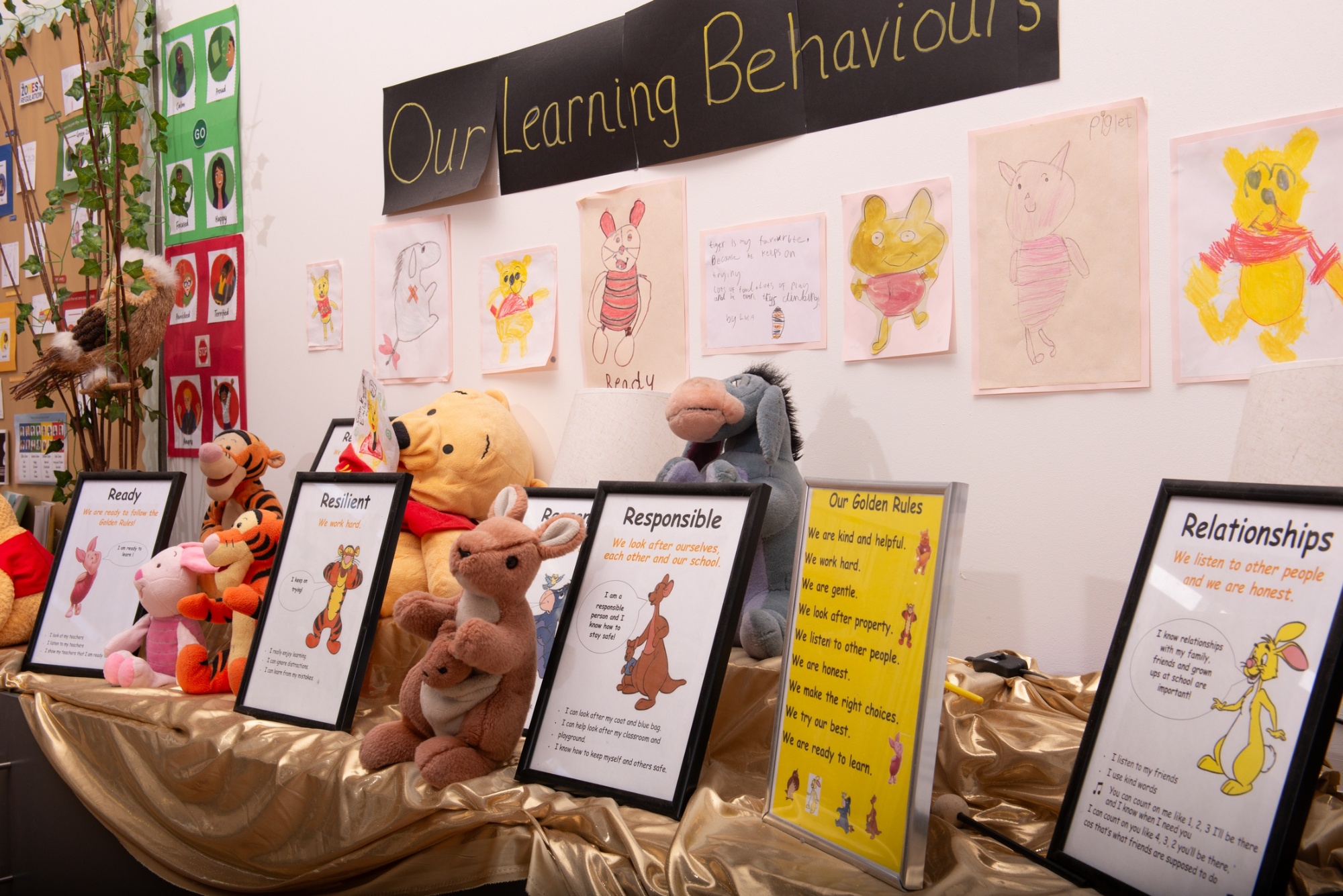 We use the Winnie the Pooh characters to illustrate and promote our Learning Behaviours and in the Hall, you will see a large Learning Behaviour display and the Winnie the Pooh soft toy characters, to remind the children of our expectations of learning and behaviour.  These link to our Golden Rules.  We focus on one Learning Behaviour a week and children are rewarded with stickers for behaviour noticed by teachers.  You will also see Winnie the Pooh characters and their associated Learning Behaviours on display in every classroom.