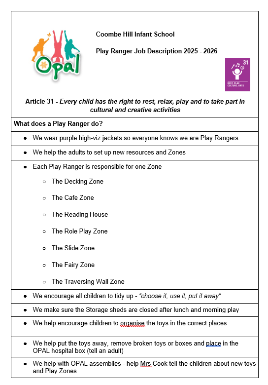 Play Rangers are specially chosen children in Year 2 who help look after our OPAL playtimes. They wear purple tabards so everyone can spot them easily. Their job is to encourage others to play, help keep the playground tidy, and take care of school property and play equipment. Play Rangers also let adults know when something goes wrong and meet regularly with the Assistant Headteacher to share ideas about making playtimes even better.