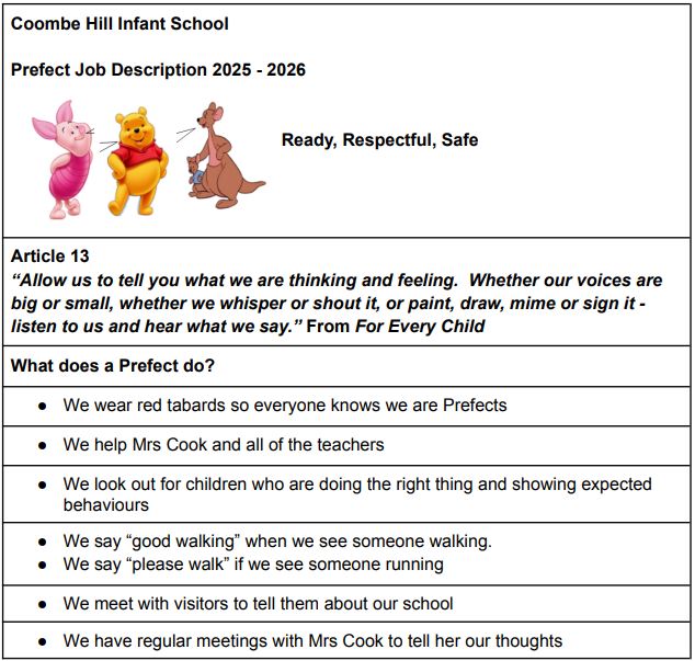 Prefects are chosen each half term to be positive role models in our school. They are given special responsibilities both inside and outside the classroom, helping to make our school a safe, friendly, and well-organised place. Prefects wear red tabards so everyone can easily recognise them. As part of their role, they complete important jobs around the school and meet with the headship team to share ideas and help improve school life for everyone.